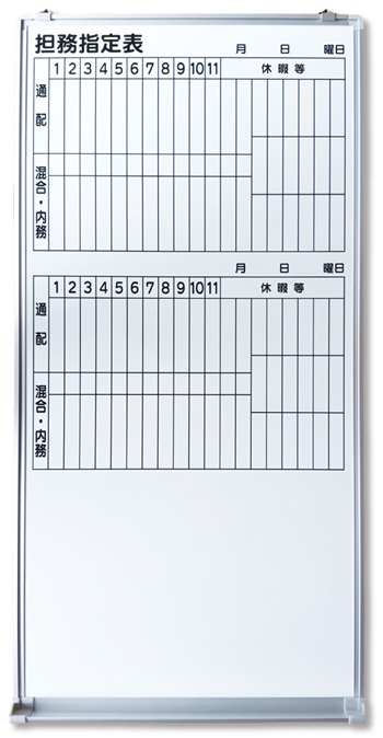 板面の印刷も、今回のものは黒1色ですが、もちろんカラー印刷も可能です。例えば、1カ月の予定表を曜日の土曜を青、日曜を赤の印刷する等がよくあります。また、ホワイトボード以外にも黒板の制作もしております。