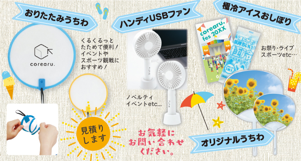 弊社では、創立記念やイベント向けのノベルティも幅広く取り扱っております。「どのようなノベルティを作ったら良いか分からない」とお悩みの方も、品物からご提案いたしますので、お気軽にお問合せください。